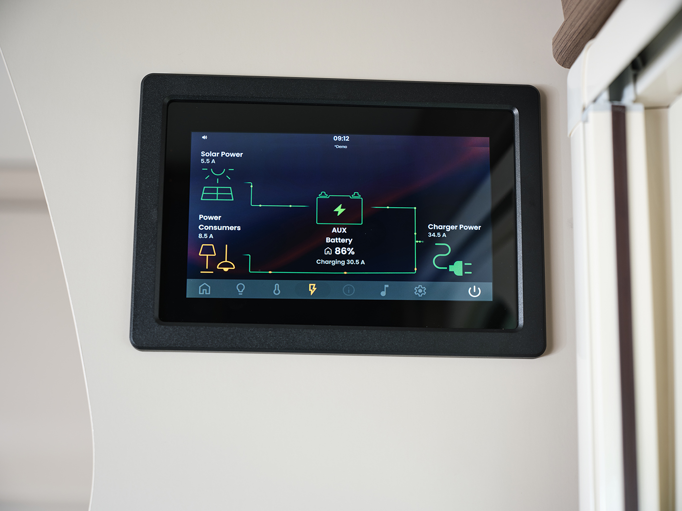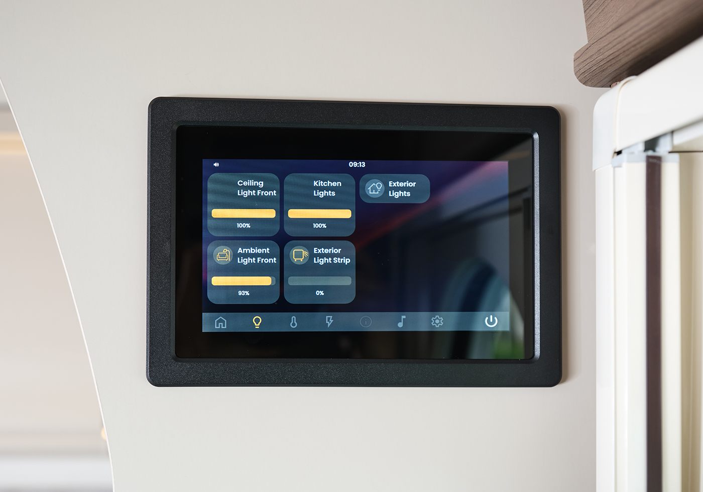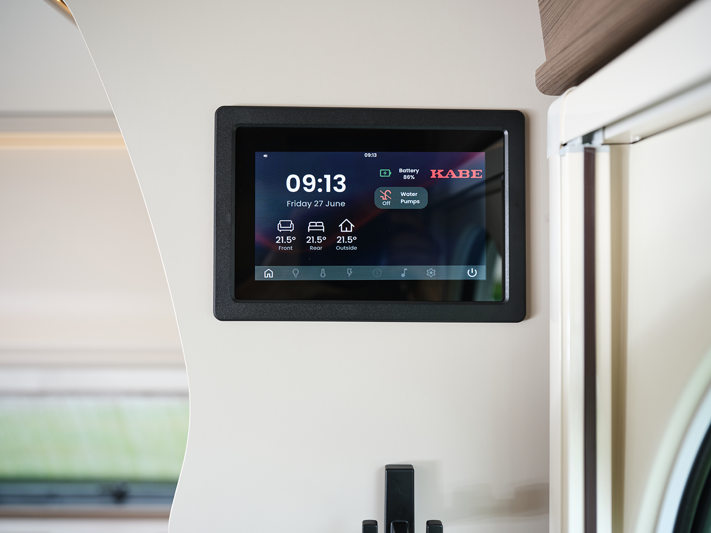 Med den prisbelønnede betjeningspanelet KABE Smart D – vinder af European Innovation Award – kan du styre mange af campingvognens og autocampers vigtigste funktioner. Den intuitive berøringsskærm er designet med fokus på brugervenlighed og giver dig et klart overblik over fersk- og spildevandsniveau, batterispænding samt styring af belysning, AC, varmelegeme, temperatur og den nedfældelige seng. Nogle tilvalg kan også betjenes via panelet.