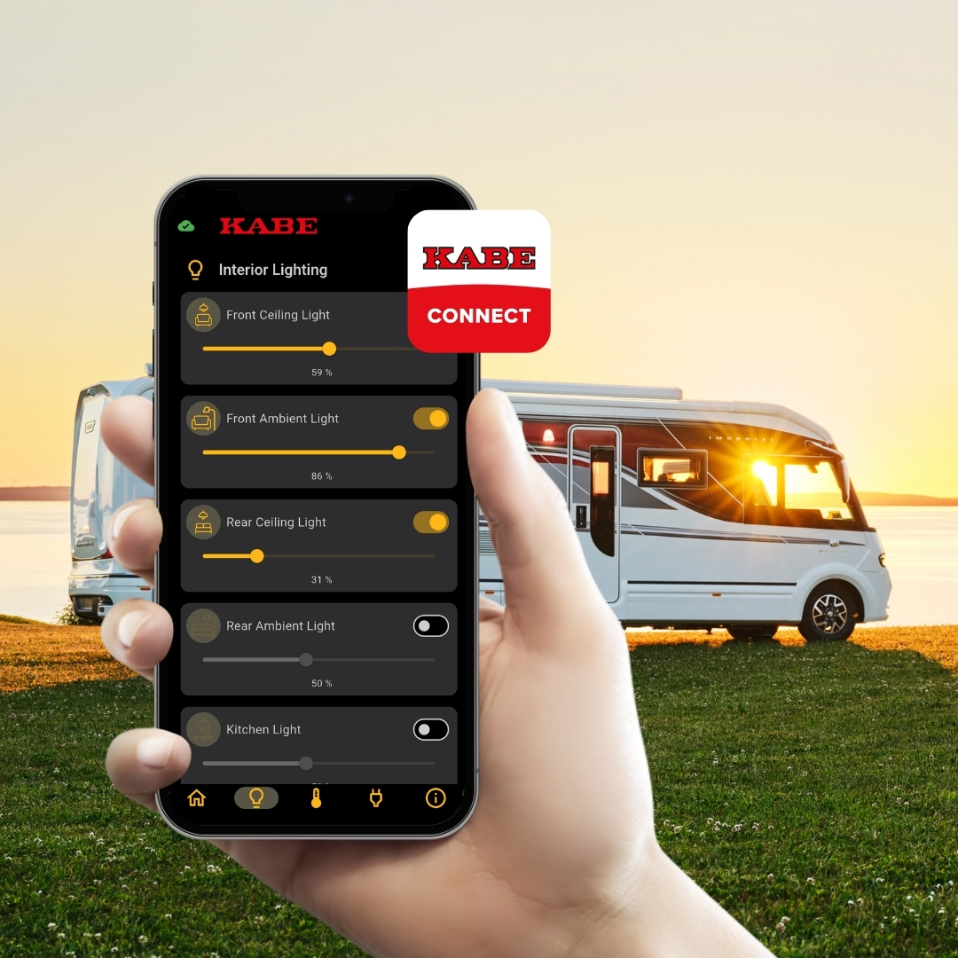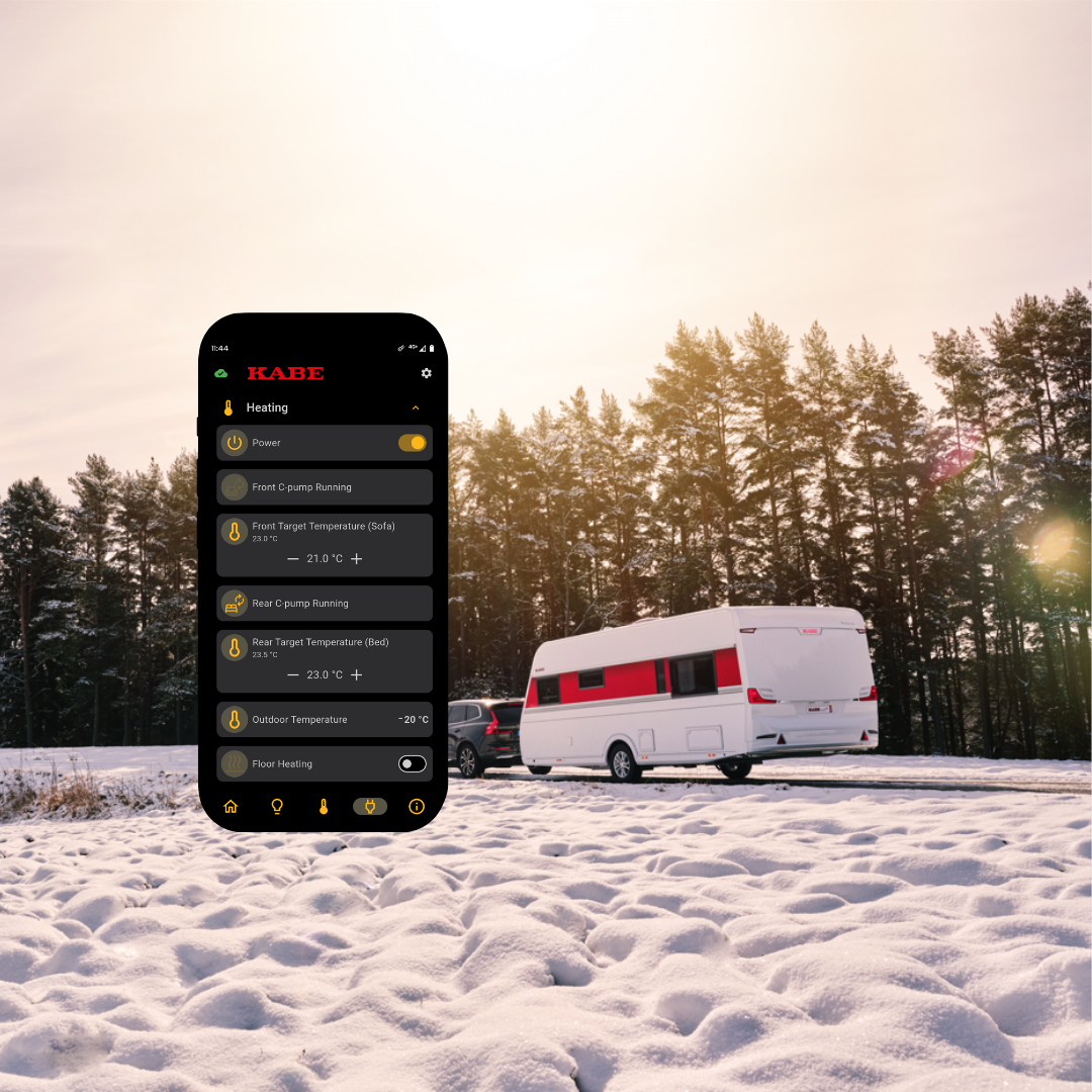 Ohjaa KABE-mökki-, matkailuautosi tai pakettiautosi KABE Connect -sovelluksella. Käynnistä ilmastointi etänä KABE:ssasi ja saavu miellyttävissä lämpötiloissa. Connect-sovelluksessa voit hallita useita eri toimintoja, jotka helpottavat elämääsi KABEn kanssa.