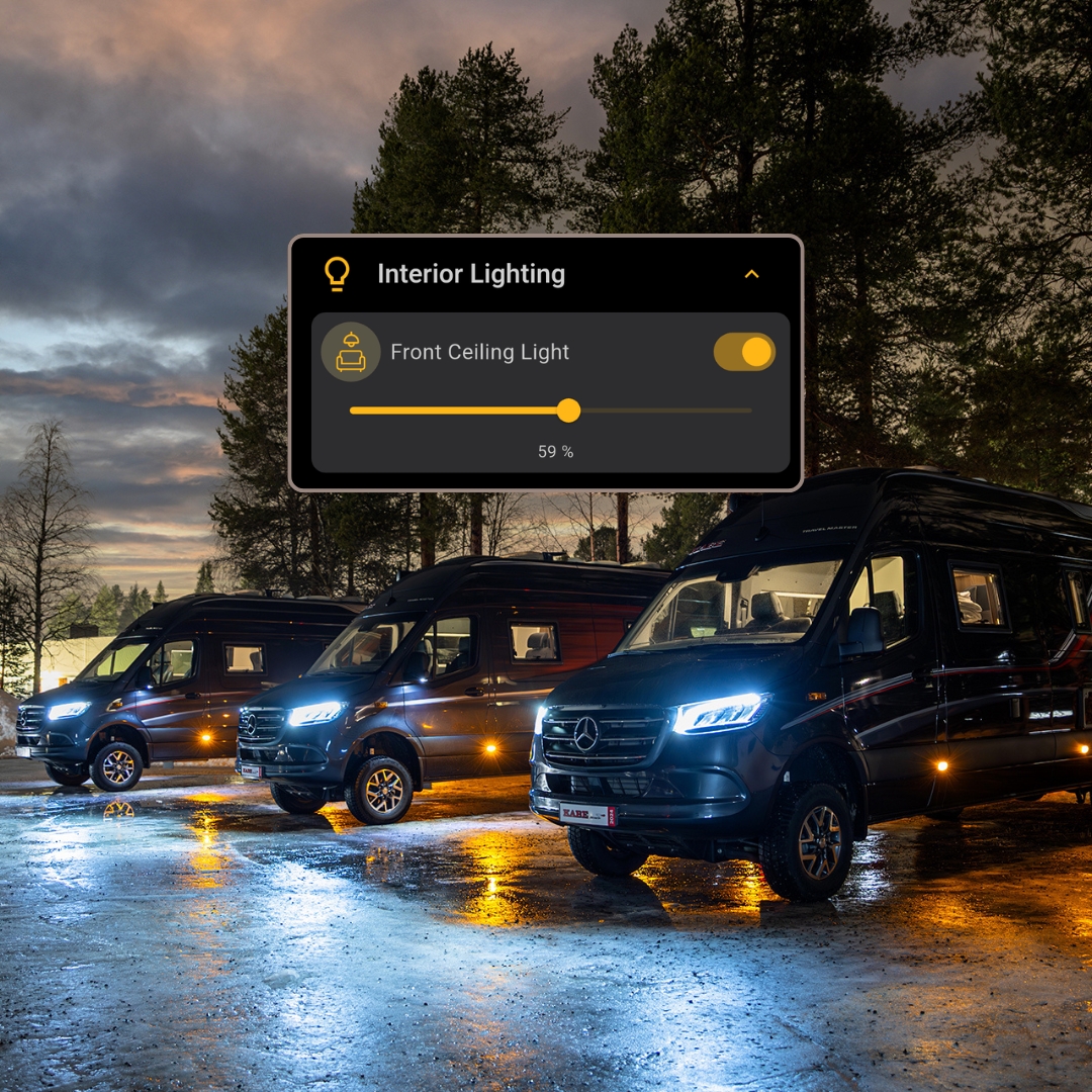 Sovellus kokoaa useita älykkäitä toimintoja yhteen paikkaan: ohjaa valaistusta, säädä lämpötilaa, hallitse sähköä ja kaasua sekä valvo akkua ja vesitankkeja – kaikki kätevästi mobiililaitteessasi.