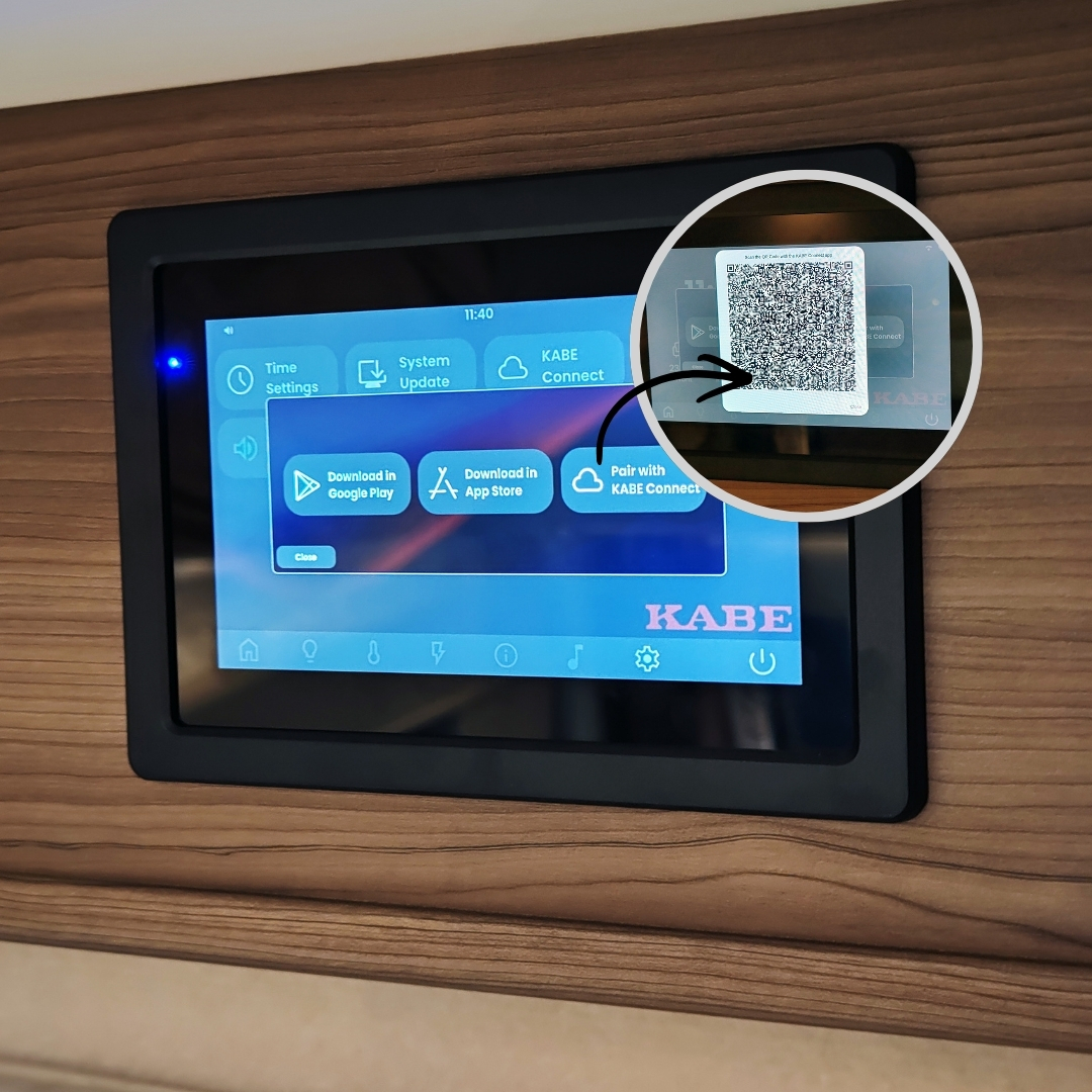 Napsauta KABE Connect -painiketta Smart D 2.0 -käyttöliittymässä. Asenna sovellus, napsauta "Pair with KABE Connect" ja skannaa QR-koodi näytöltä, valmis! Tiliä ei tarvita ja sitä voi käyttää useilla matkapuhelimilla ohjaamaan KABE:a.