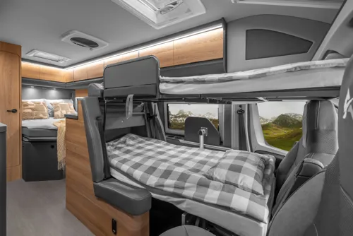 Plats för fyra med unik våningssäng. Väldigt rymlig van med mycket förvaringsmöjligheter.