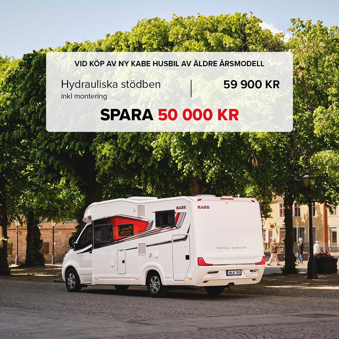 Vid köp av ny KABE husbil av äldre årsmodell erbjuder vi hydrauliska stödben för endast 59 000 kr (Ordinarie pris 110 000 kr) Du Sparar 50 000 kr. I priset ingår monteringen.